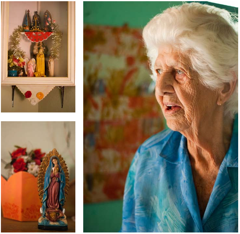 Oratório, esquerda a cima. Imagem de Nossa Senhora Guadalupe, esquerda a baixo. Dona Maria Paião, a direita.