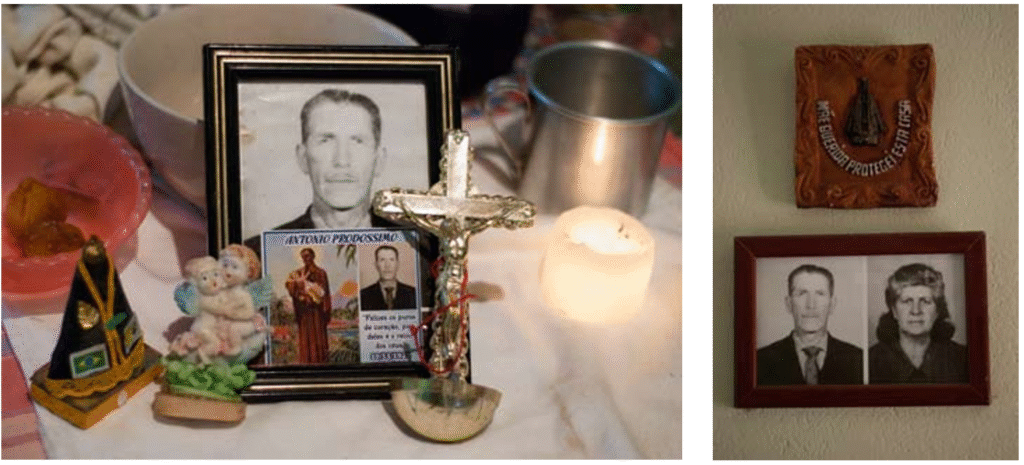 Altar de reza cotidiana de Dona Maria Paião, a esquerda. Retrato dela com seu marido, junto a imagem de Nossa Senhora Aparecida, a direita.