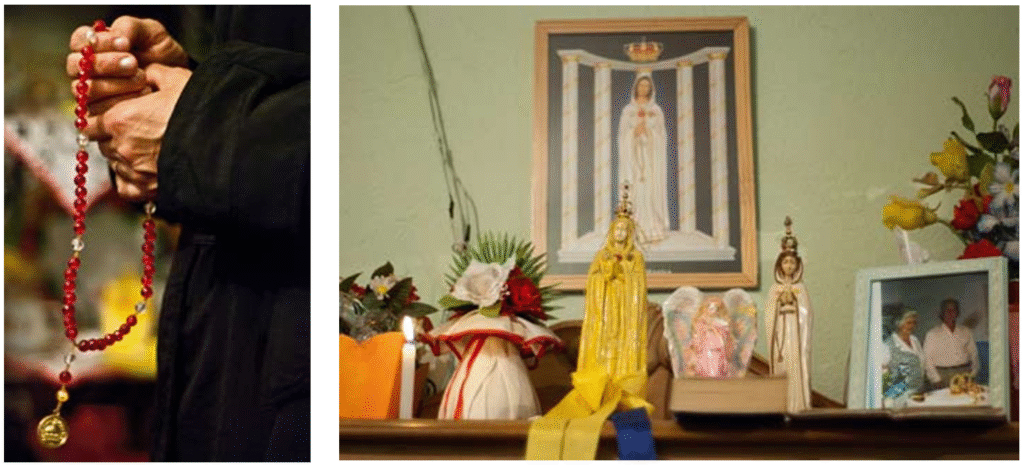 Shirley, rezando o terço da Nossa Senhora Rosa Mística, a esquerda. Altar preparado para a reza do terço, com três representações da mesma santa, a direita.