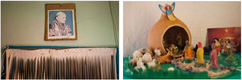 Fotografia do Papa João Paulo II, como decoração da casa, a esquerda. Presépio montado por Shirley, a direita.