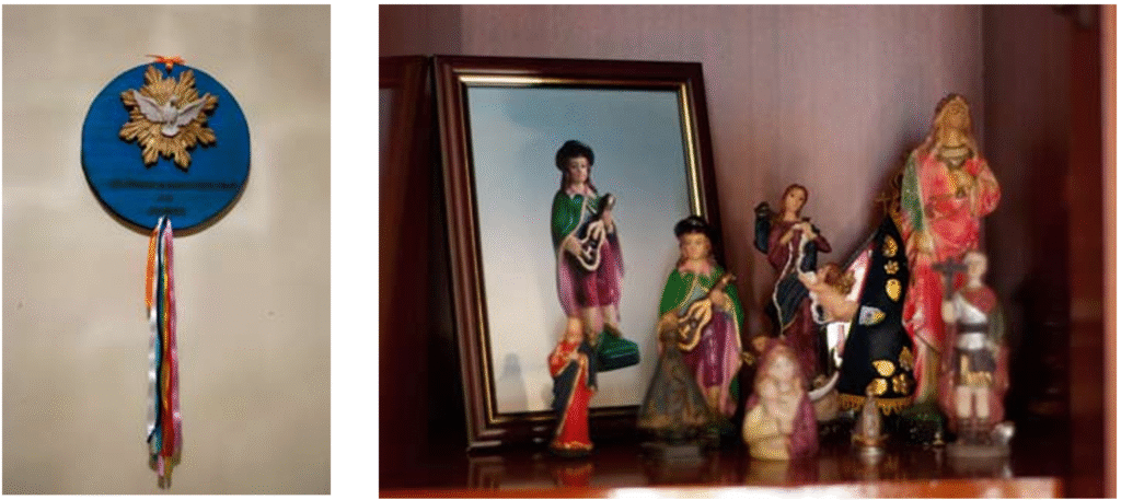 Na decoração da casa da Dona Maria Paião, existem muitos objetos religiosos, além de um oratório com diversos santos.